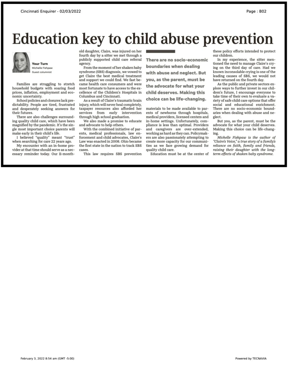 “I admire Jon and Michelle Fishpaw’s tireless efforts in helping to raise awareness on Shaken Baby Syndrome. It was truly an honor to work with them to introduce and pass Claire’s Law in Ohio.”